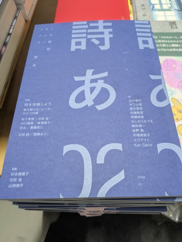 2025年5月に創刊され、各種メディアに紹介されたドキュメンタリー詩誌「詩あ」の第2号。特集は「詩を投稿しよう 書き続けることへの、ひとつの扉」。松下育男×石松佳の特別対談を皮切りに、「現代詩手帖」選者を務めた川口晴美、峯澤典子の特別インタビューを収録。他に「現代詩手帖賞」受賞者の花氷や2023年に第一詩集を刊行した嘉陽安之のインタビュー、石田諒と雪柳あうこの寄稿文などボリュームフルな内容。寄稿詩のテーマは「送る(贈る)」、山内優花、木下太尾、鹿又夏実、佐藤帆菜、伊藤暁里、ゐしもりみづゑ、南田偵一、佐野豊、手塚真梨子、ユウアイト、Kan Sanoの11名が寄稿。中でもKan Sanoは音楽の世界で活躍しているミュージシャン。連載は石松佳、山﨑修平、今号から杉本真維子の連載もスタートする。