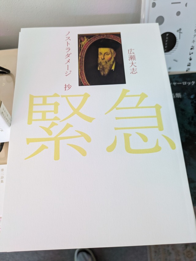 カッコいい詩集が読みたいならとにかくこの詩人を。 ポエマ川越でも圧巻の朗読でした。 モダンホラー詩の旗手、広瀬大志最新詩集。 [緊急] 七月を越えるために、 急げ、 ダメージに、おまえは象徴されている 以下、版元紹介です。 西脇順三郎賞受賞詩人であり広瀬大志が、かつて自らの手で発行していた個人詩誌『妖気』。 その最新版が六連作で再びこの世に舞い戻る。 第2弾は預言者であり詩人のノストラダムスへのオマージュをふんだんに籠めた連作「ノストラダメージ」シリーズ全10篇のうち4作を収録!少数のみの限定部数発行の為、お見逃しなく。夏の魔除けに、是非! 発売日 2025/6/24/本文32ページ/ サイズ A5版
